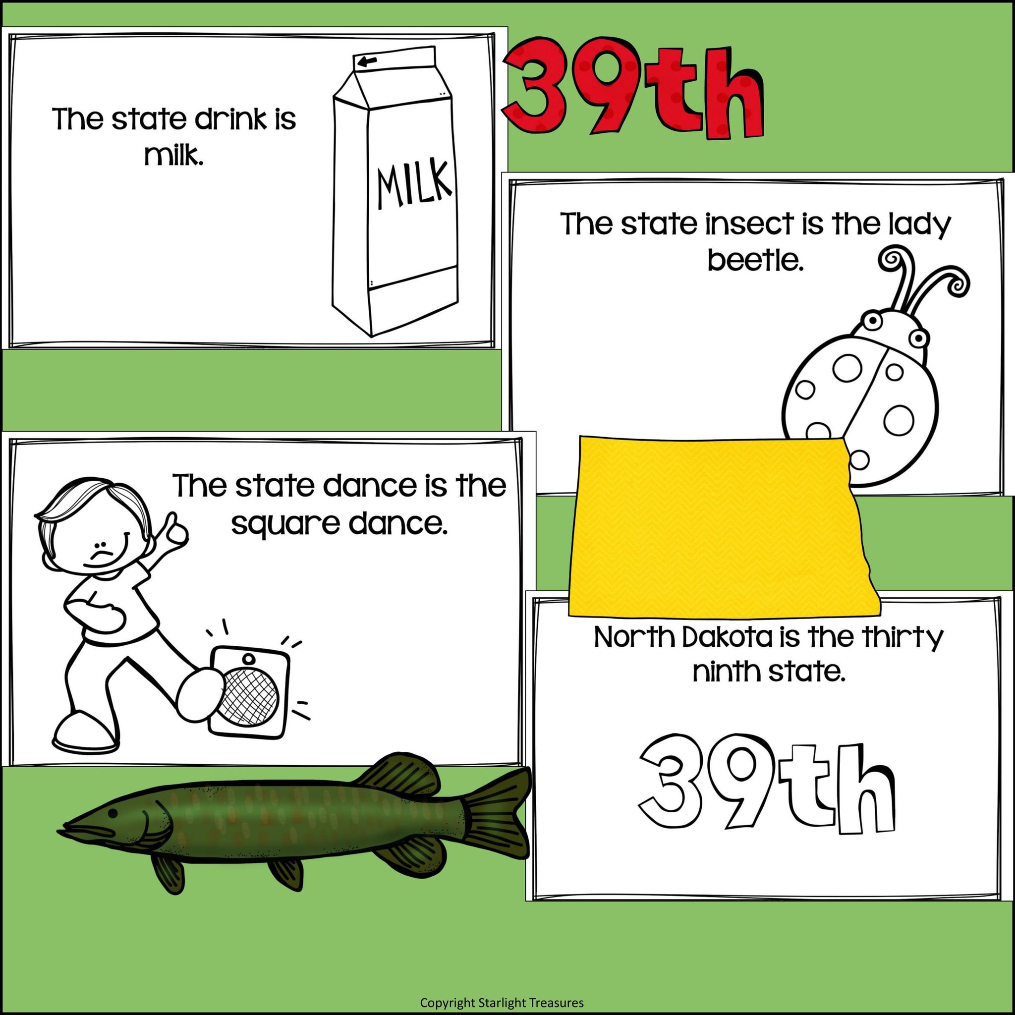 This North Dakota Mini Book is perfect for your students to learn about North Dakota! This book can be used for a very basic state study in lower elementary grades! This is perfect for Pre-k, Kindergarten, and 1st Grade. Each page has a basic fact about North Dakota and a scene or illustration to get students to connect to the words. The scenes can be colored in as a fun activity for the students!